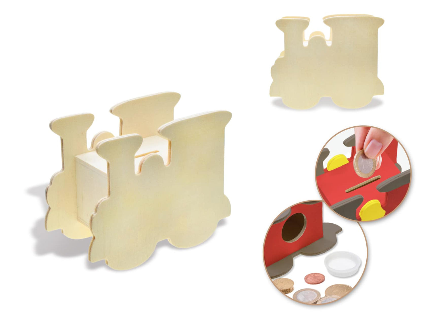 Banque à décorer en bois en forme de train, parfait pour les projets de bricolage.