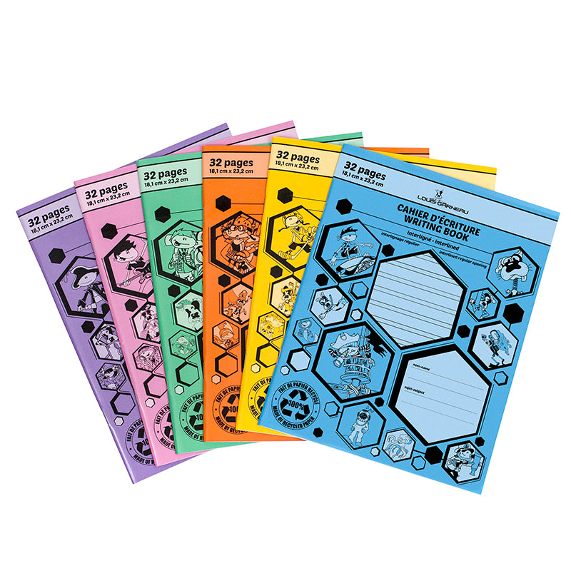 1 cahier d'écriture interligné de 32 pages Louis Garneau. 9 x 7". Couverture plastifiée et papier épais. Couleurs variées. Vendus à l'unité. Voir le choix de couleur.